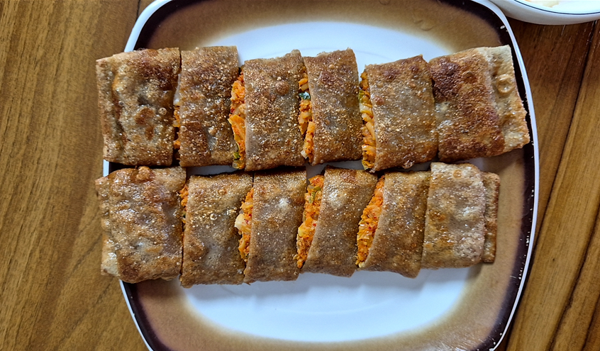 메밀전병도 수준급입니다. 사이즈에 놀라고 맛에 놀라고 가격도 합리적입니다. 7,000원에 2피스를 먹음직하게 커팅되어서 나옵니다. 김치와 각종 재료가 전병의 속을 가득 채워주고 입맛을 돋우는 정도의 맵쌀함도 있어 2피스로 둘이 먹기는 살짝 아쉬움이 남기는 합니다. 그럼 좀 푸짐하게 감자전도 함께 드시는 걸 추천드립니다.
