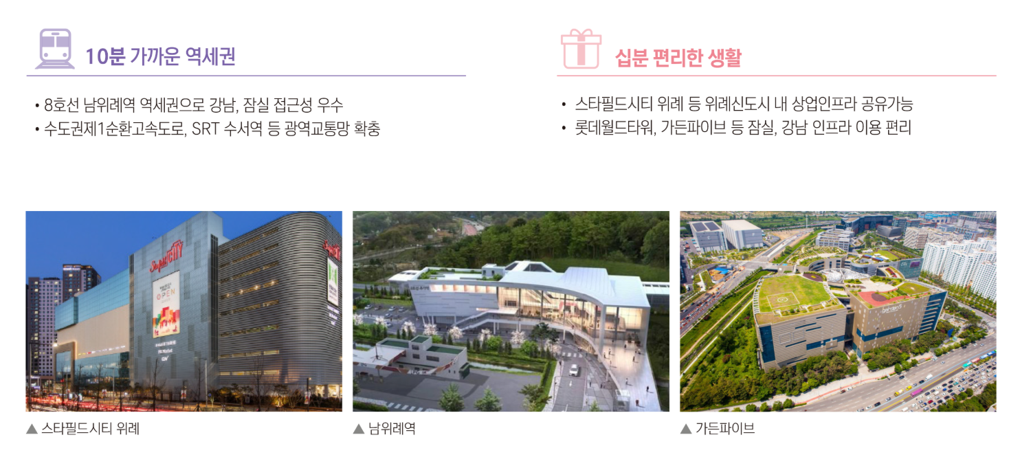 강남 접근성 + 위례생활권 + 육아 특화 커뮤니티까지 삼박자를 갖춘 입지와 구성 때문입니다.